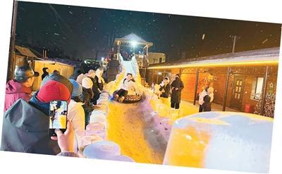 玩雪滑梯、看表演等成为游客夜游横道河子镇的新选择。